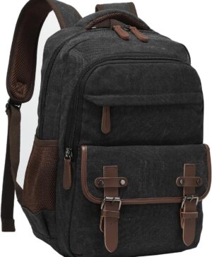 Canvas Laptop Backpack with USB Charging Port, Vintage Daypack for Men Women, Black Travel Work Rucksack Computer Bag Bookbag Fits 15.6 Inch Lapop, Black