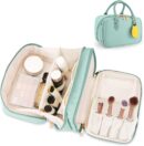 - Large Capacity: Measuring 9.8×6.3×5.5 inches, the cosmetic bag has 2 separate compartments to comfortably hold all your favourite cosmetics, make-up tools, toiletries, travel essentials, etc. Each compartment comes with multiple pockets to keep your cosmetics organised. The EVA pocket is designed specifically for holding makeup brushes, sponges and puffs.